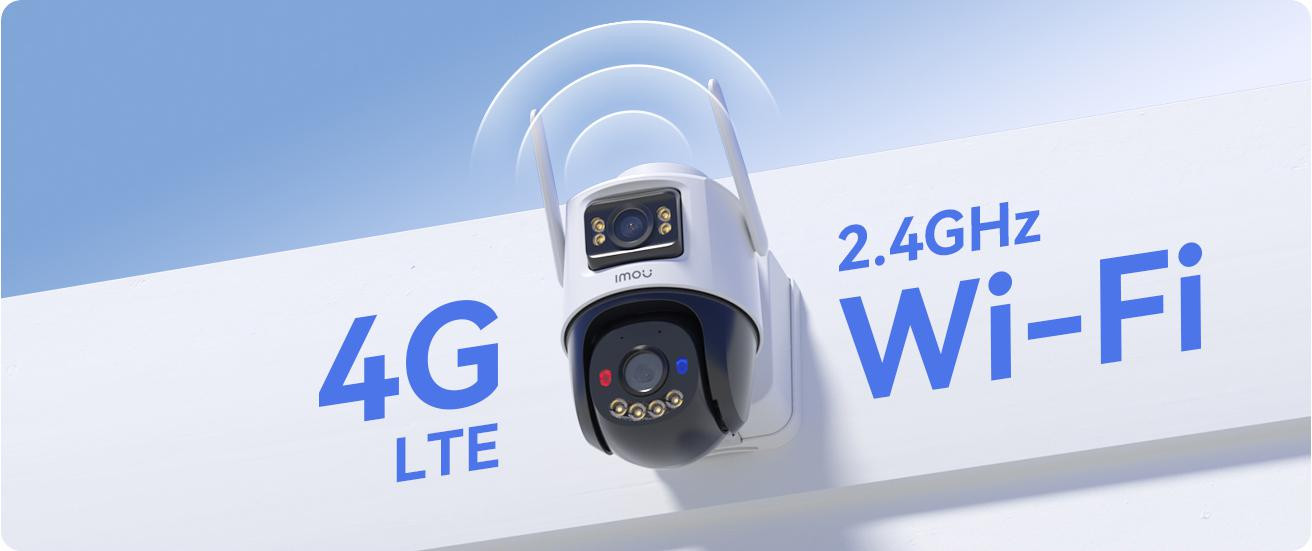 Kamera Imou AOV Dual obsługuje zarówno Wi-Fi 2.4 GHz, jak i sieć 4G LTE². Urządzenie automatycznie przełącza się między połączeniami w razie utraty sygnału, dzięki czemu monitoring działa nieprzerwanie 24/7, bez ryzyka rozłączenia.